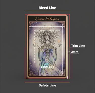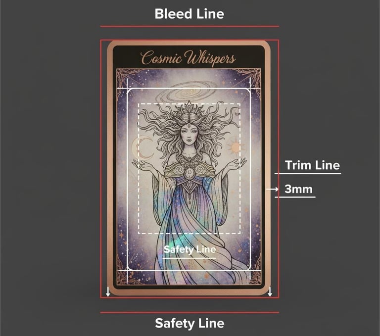 Bleed: Think of this as a "Safety Zone." A giant blade cuts your cards. That blade might shift 1mm. You need to draw your background art 3mm "past" the real edge of the card. That way, if the blade is slightly off, you still have a perfect edge—not an ugly white sliver.