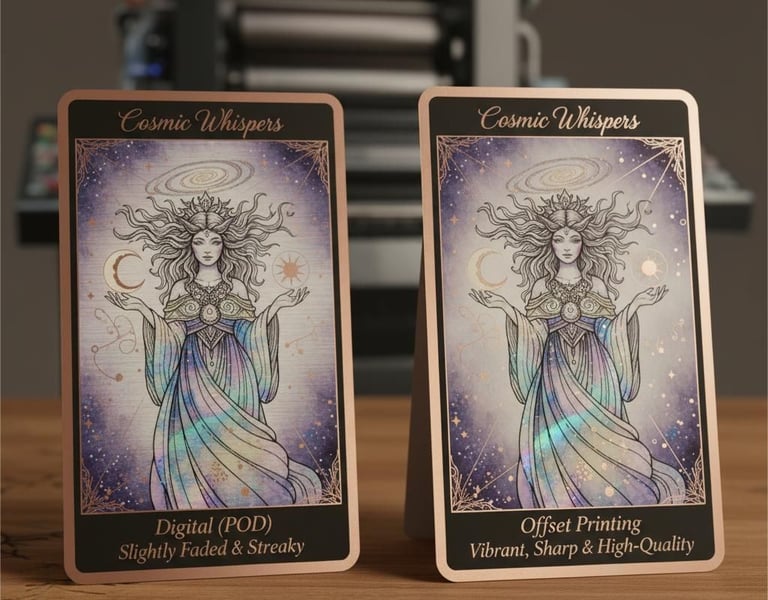 POD services use "Digital Printing." A real factory (like the ones most Kickstarter card game manufacturers use) runs "Offset Printing" on a Heidelberg press. The difference is like printing a photo on your home inkjet vs. developing it in a professional darkroom.